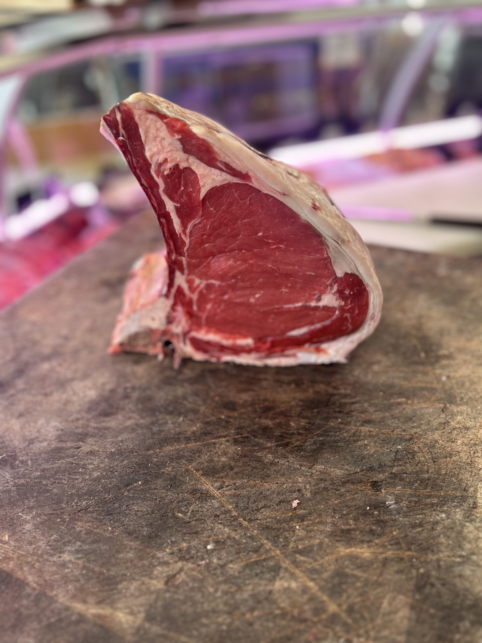 Bistecca alla Fiorentina, taglio spessore 4 cm, carne bovina allevata in Toscana. Pronta per la griglia o la piastra. Confezionata in scatole isotermiche con ghiaccio secco e sottovuoto e spedita in 24 ore.