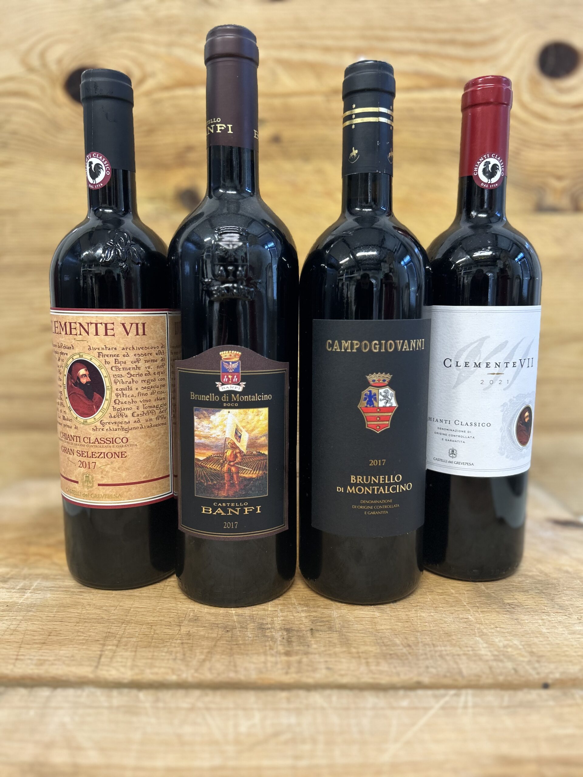 Brunello Banfi, Brunello campo Giovanni, Clemente VII gran selezione, Clemente VII classico, Le coste Riserva, Bolgheri Aska, Poggio Turrito, Castel Greve |